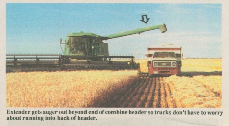 Developed by M&R Machines Ltd., Weyburn, Sask., the design of each do-it-yourself kit depends on make of combine, but each includes a bolt-on extender tube, an extra section of auger flighting, and an add-on support rod that helps support the extra weight and length of modified auger.