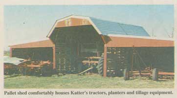 Here's more about the machine shed and pens Katter built with the pallets. They went up easier and faster than conventional buildings, in part because pallets form both the structure of the building and also have facing boards on them to attach siding and roofing to.
