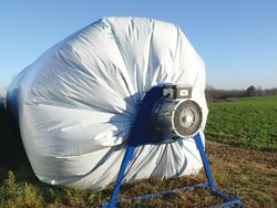 What makes the bagger unique is that bales are pushed into one end of a long “sausage-type” silage bag using a specially designed, square bagging frame. But instead of shrinking the bag against the bales to keep air out, the Air Barn uses a large fan to dry the bales.