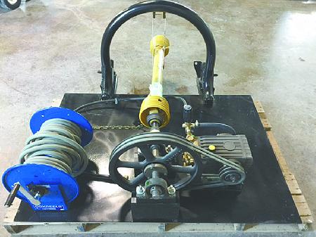 Barry used a General brand pressure washer pump and set it up to operate at between 2,500 and 3,000 psi. They mounted it, a hose reel and a power transfer shaft in block bearings on a 3 by 4-ft. square platform.  Only the power shaft had to be fabricated at a local machine shop.