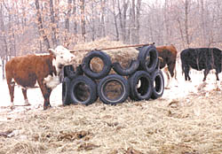 "It's a good use for old tires, and all it cost me were a few bolts and washers," says Siemers. "I can move it easily with the tines on my loader-mounted bale fork. The tires are bolted so tightly together that they stand upright without any additional support. In fact, I made a tire feeder for horses that doesn't have a pipe frame on top at all. It works great because there's nothing in the way for horses to rub their manes out. The horses can bend the tires over, but the tires always come right back up. You could drive a post or two next to the feeder and attach it to the tires to keep the sides from bending."