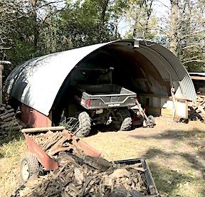 They store firewood in one hoop building, which has an aluminum door at one end, with an attached metal screen to protect it from falling wood. “We fill 3/4 of the building with firewood and park the log splitter in the remaining space,” says Jack.