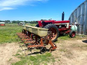 He picked up a 6-row, 30-in. row IH cultivator at one auction and a set of fertilizer boxes from a Deere 7000 planter at another one. He also picked up a hydraulic drive cross auger at a third auction.