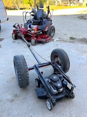 Hernke uses a 20-in. push mower mounted on a small two-wheeled cart. The cart had a 4-ft. long reach made of 2-in. tube steel that he extended to 8 ft. so he can push the small mower up and around culverts with his 6-ft. zero-turn.