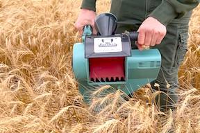 The hand-held, rechargeable device works in all grains. It contains a small thrashing drum, fan, and a choice of concaves depending on the crop being sampled.