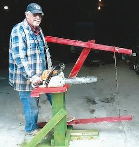 Harlen Grovom of Park River, N.D., has built a chainsaw starter that he can operate with his foot. At 91, he needed to modify his equipment to match his capabilities. “My elbows hurt after two pulls. Now, I use my leg and feet to start it,” he says.