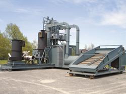 Fransham says his pyrolysis system operates at 378 to 380 degrees C. It works by vaporizing and condensing the biomass in the absence of air.