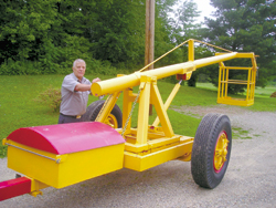 A 3 by 36-in. hydraulic cylinder powered off a battery-operated hydraulic pump lifts the 19-ft. long boom, made of 6-in. dia. steel gas pipe. The boom pivots on a 1 1/2-in. dia. rod. Newell also made a bucket for the boom that attaches to the end of the boom. Pivots on the pipe and boom keep the bucket level at any height.