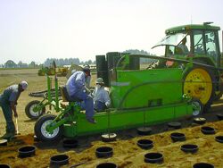 The pot-setting rig excavates a ditch deeper and wider than the pot to be set, lays down a drain tile in the bottom of the ditch and an irrigation hose along the side of the ditch. Workers riding on the platform place pots in the ditch at regular intervals. Other workers walking alongside, set up spray nozzles beside each pot and fill in around the pots. Seven-pound metal lids, also fabricated in the nursery shop, are then placed over the pots to keep dirt out until the planted pots are inserted.
