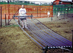 The 5-ft. wide unit adjusts to any gate opening up to 16 ft. It consists of a series of 2-in. wide polyester belts attached to two heavy duty steel pipes.