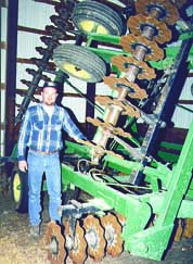 "They do a much better job of drying out wet soils than the straight coulters on a conventional disk, allowing us to plant no-till beans earlier than we ever could before," says Dean Buzzard, St. Elmo, Ill., who mounted 20-in. dia., 1 7/8-in. wavy no-till coulters on his 34 1/2-ft. wide Deere disk. The coulters are normally used on no-till planters and drills. Buzzard gives most of the credit for the idea to Alen Ragle of Loogootee, Ill. He bought the Deere 235 disk used at a sale and purchased new wavy coulters from Nichols Blades of Bloomington, Ill. The wavy coulters are designed to mount on round shafts. However, the disk was equipped with a square shaft so he had the manufacturer cut square holes in a set of coulters to match the disk's shaft. Buzzard spaced the wavy coulters 9 in. apart, offset on two gangs. "They do a great job of airing out the soil," says Buzzard. "We use it 24 hours before planting no-till beans. We use a 275 hp Deere 9100 4-WD tractor to pull it at about 8 mph and run it at an angle through the field. We don't use it on corn ground because we plant corn conventionally. In the past we tried using a conventional disk to dry out the soil. However, we found that we had to make two passes, which packed the soil. Also, the straight coulters tore the ground up so bad that we had to come back later with a field cultivator to break up clods and slabs. "We made a second unit out of a Deere 330 disk. We find that Deere disks work best because they have square frames instead of angled ones. "We used 85 coulters on each disk so our total cost was minimal."