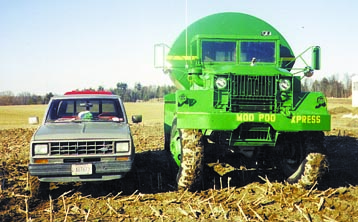 "It goes right through mud that would stop a tractor-pulled spreader in its tracks," says Kent Keller, Kinderhook, N.Y., who equipped a 10-ton tandem axle Army truck with a 5,000-gal. liquid manure tank. The truck rides on tires that stand more than 4 ft. high.