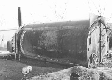 He paid for a 26-ft. long, 10-ft. dia. section that had been cut off a 60-ft. rail-road tank car. One end of the tank was closed. A local blacksmith welded a steel divider inside the tank to separate it into a 16-ft. fire chamber and a 10-ft. long water tank. The water tank holds 3,000 gal.