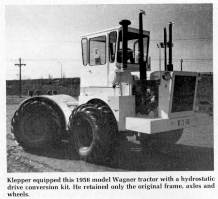 "Best candidates for conversion to all-hydrostatic drive are used Wagner, Versatile, or Steiger tractors in which the clutch or transmission is either wearing out, or already shot," Robert "Bud" Klepper, manager of Acme's Hydrostatic Drive Division, told FARM SHOW. "In converting them to all hydrostatic drive, we strip everything except the frame, axles and wheels. All component parts we put in are new, except for the replacement engine which can be either new or rebuilt. Or, if the original engine is in good shape, it can stay. If you can find an older Wagner tractor that's priced cheap because the engine, transmission or clutch is shot, buy it. It can be turned into a top-notch hydrostatic tractor -- for about half of what you'd pay for a new, comparable 200-plus horsepower tractor purchased new," advises Klepper.