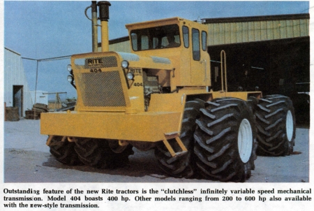 New Rite tractors are available in 5 different models ranging from 200 to 600 engine hp. They're available with the new-style transmission; a Kt 400 Cummins diesel engine (Detroit or Caterpillar optional); A Rite transfer case designed by the Curtises; a Spicer driveline; a Clark or Caterpillar axle; a 60-in. wide custom-built cab; 30.5 by 32 duals; and Budd type wheels. The model pictured weighs 45,000 lbs. and measures 15 ft. 11 in. wide (with duals). Like all models, it can be ordered with a conventional transmission (Ag 212 Fuller with 15.5-in. double plate self-adjusting clutch) but the Curtises anticipate that most customers will want the new "clutchless" and infinitely variable speed mechanical transmission.