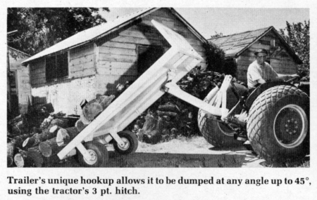 Here's a dump trailer without any hydraulic cylinders, hoses or valves. It's attached to the tractor with a unique 3-pt. hitch that allows it to dump at a 4 degree angle, just by backing up.