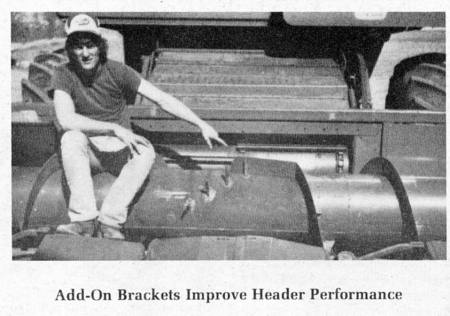 Simple, do-it-yourself brackets, designed by Harvey Bish, of Giltner, Neb., improve combine header performance when the crop is short and not much material is moving into the machine. Harvey was harvesting a short-growing crop of soybeans with his Deere Row Crop header when he hit on the idea of installing the brackets. "In places where the crop was short and thin, it wouldn't feed into the feeder house and would plug up. To keep it from bunching up, I installed these positive feed brackets which solved the problem."