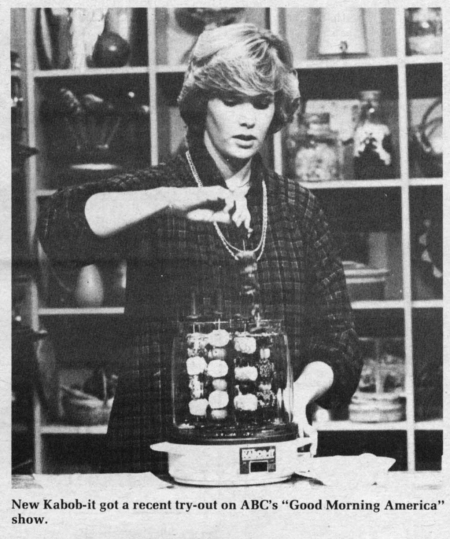 Most any meat or vegetable can be skewered on the Kabob-It. Simply thread it with your favorite food selections -- suggested recipes are provided -- and plug it in on the table or counter. A clear Pyrex cover prevents grease splatter. The average meal takes from 10 to 20 min. to cook.