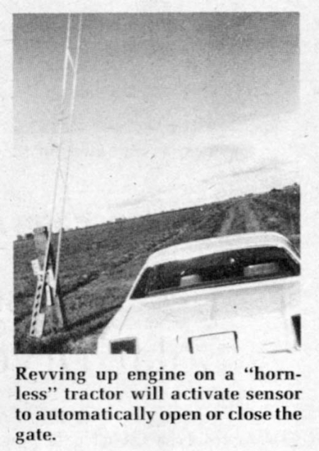 Friends and neighbors can operate the gate, too. You simply tell them to sound their horn when they get to the gate and they can drive right through. No special horn is required. A combination of volume and duration of the sound is all that's required. There have been no problems with cattle bellowing and opening the gate, reports Wayne Skeem, the inventor. Intruders are kept out.