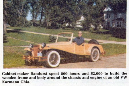 Sandhurst, a carpenter and cabinet maker by trade, had an old VW Karmann Ghia he intended to restore conventionally. During the construction industry slowdown last spring, he had extra free time. That's when he decided to restore the car with wood instead of metal or fiberglass. The engine came from another Volkswagen and is mounted up front.