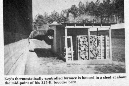 What Key has designed is thermostatically-controlled wood furnace housed in a shed not more than a few feet away from the 325-ft. long barn. Air is ducted into the barn by conventional heating ducts to large center duct that carries heat to either end of the long barn, keeping temperatures from 60 degrees to 90 degrees, depending on the age of birds.