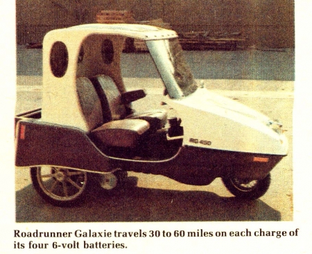 "It operates for less than a penny a mile and is great for less-crowded country roads, making it an ideal runabout for farmers and ranchers," says Donald Quinsey, national marketing director for the new Roadrunner Galaxie electric car. "It's in production, ready to show its stuff to anyone seriously interested in low cost transportation. Our tests show that total recharging and replacement cost of the batteries is just under a penny per mile."