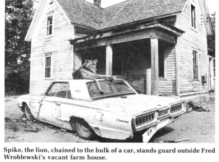 Spike spends most of his time sleeping on the roof of a wrecked Thunderbird parked next to the house. Occasionally, he leaves his perch to walk around the unfenced yard on the end of a 30-ft. steel chain and to munch on dry dog food or meat scraps left for his enjoyment by Wroblewski.