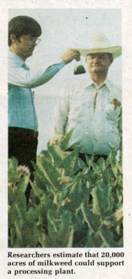 Alder and his associates are now calculating the economics of milkweed production on a commercial basis. They visualize a processing plant with growers supplying it on a cooperative basis. They speculate that 20,000 acres of milkweed would supply one plant.