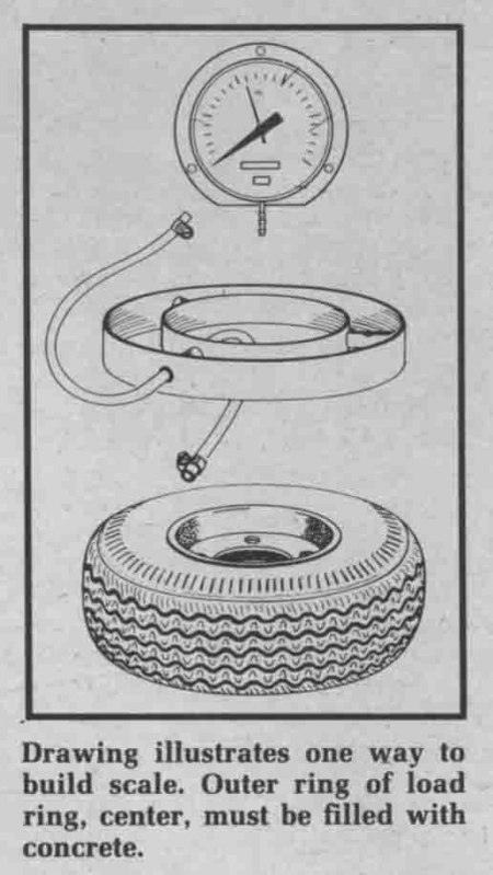 The idea is to fill a tire with water, remove the air valve, and hook it to a hose that runs to a pressure gauge that converts the pressure to weight. A "load ring" that fits over the contact area of the tire, mounts on top of the tire. The load ring can be made out of wood, plastic, or any other stout material. Any tire can be used. If an older, bias ply tire is used, an inner tube should be placed inside.