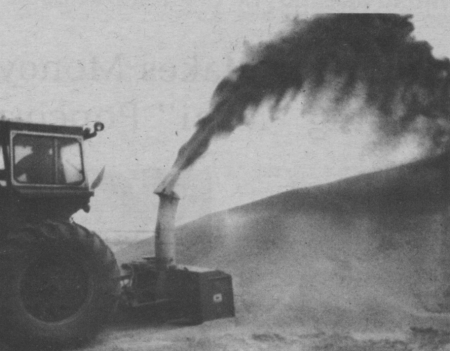 Besides handling grain piles, the Thompsons have also used snowblowers to load grain into flat storage. "We dump rain into the middle of our quonset building and then blow it against the sides with the snowblower."