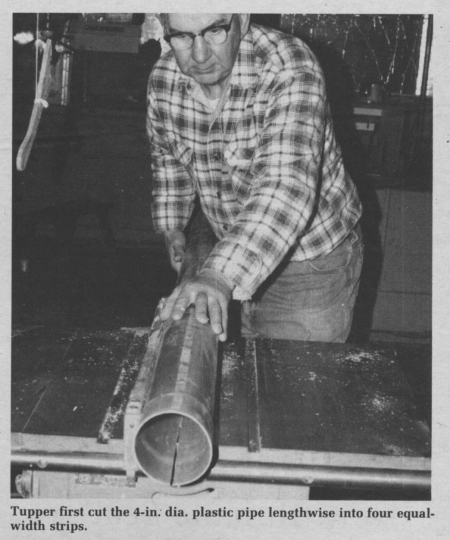 They bought two 10-ft. lengths of black 4-in. plastic pipe at a local hardware store. Using their circular bench saw, they cut it lengthwise into four equal-width strips, making the cuts at 12, 3, 6, and 9 o'clock. "If you don't have a circle saw, a sabre saw can be used to follow cutting lines hand drawn onto the pipe," says Robert.